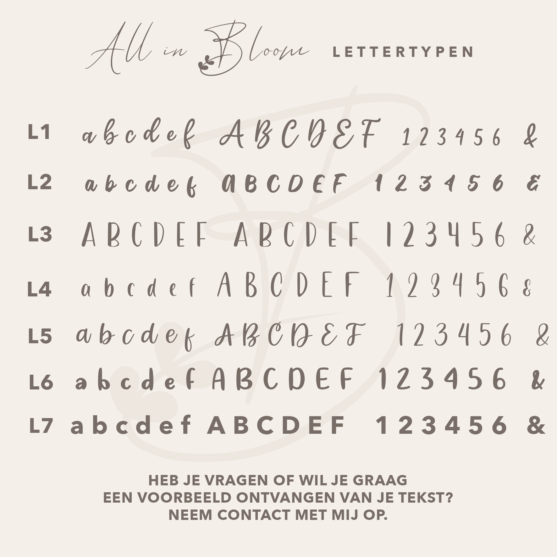 De tekst kan in twee kleuren verkregen worden: wit en zwart. Bij een licht boeket met zachte kleuren adviseer ik witte letters. Een boeket die wat grover is qua kleur gaat mooi samen met zwarte letters.